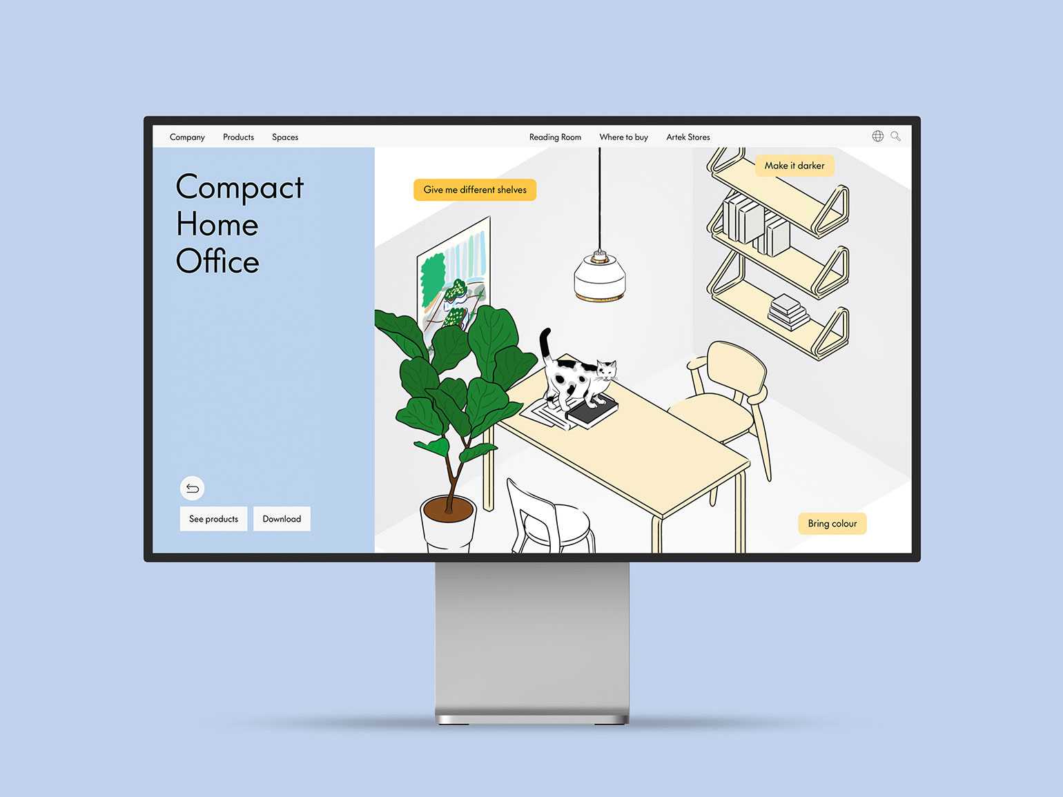 Авторы сделали серию тёплых иллюстраций, чтобы усилить ощущение камерности и уюта. Однако рисунки нужны не только для красивого визуала: Kokoro & Moi вместе с WAF GMBH внедрили в сайт игровой инструмент, с помощью которого можно создать домашний офис. Получается красивая комната с мебелью из каталога, в которую можно добавить кошек, собак и тапочки.
