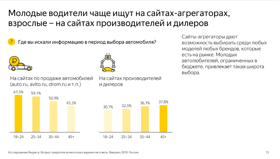 Также молодежь чаще старшего поколения пользуется сайтами-агрегаторами (61,5% против 43,2% соответственно). Аудитория 45+ предпочитает агрегаторам сайты производителей и дилеров.