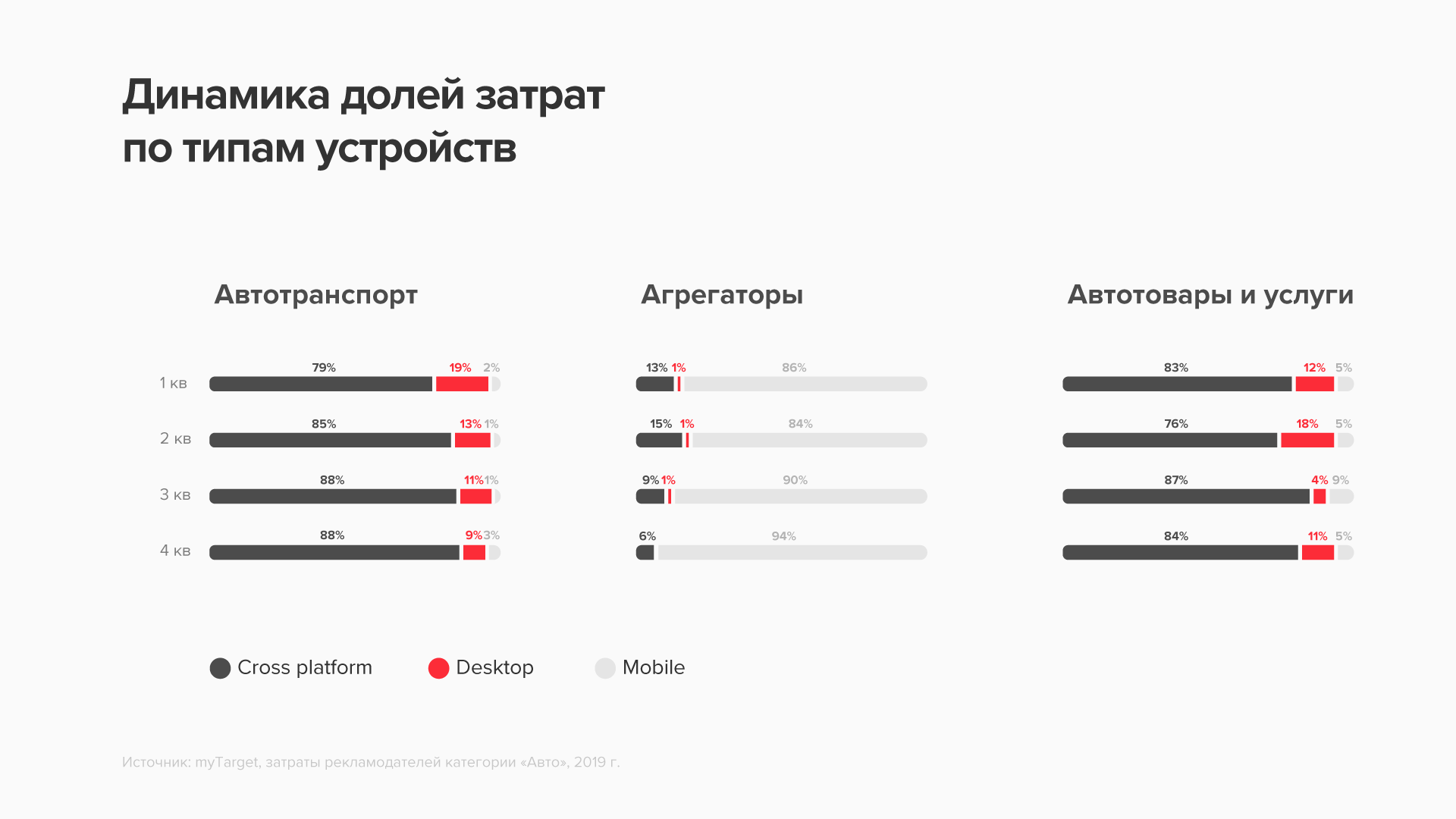 По данным myTarget, в рекламе автотранспорта, автотоваров и услуг лидируют кроссплатформенные размещения. Агрегаторы предпочитают мобильные рекламные форматы.