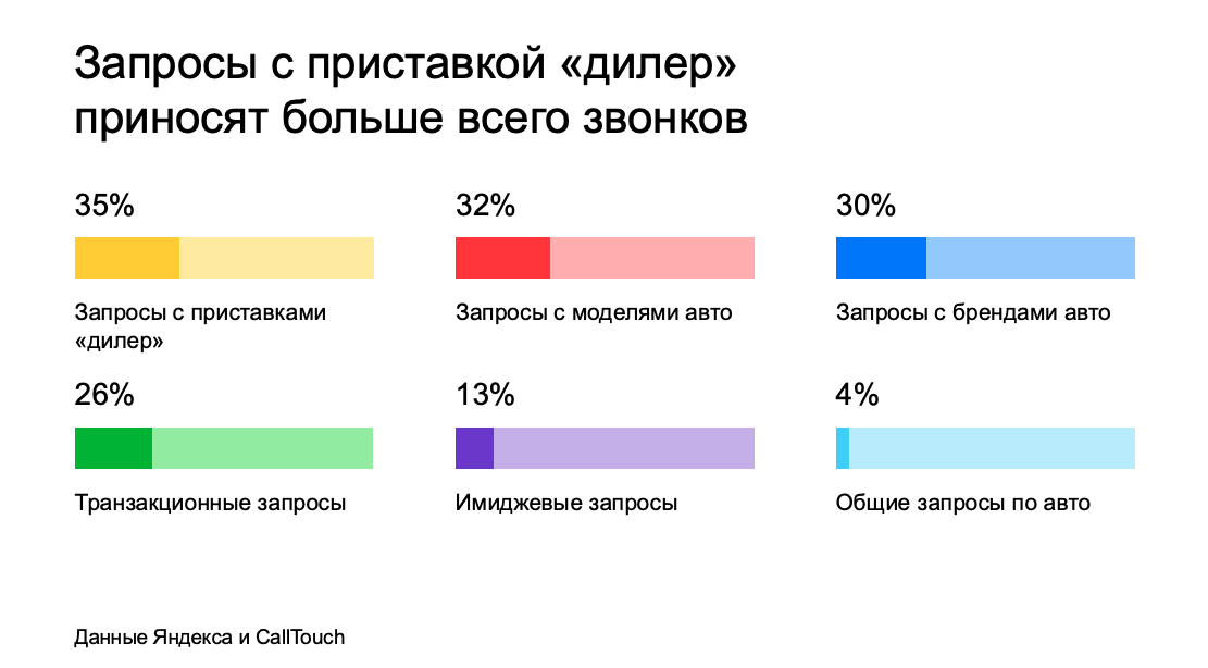 По данным Яндекса и Calltouch, перед звонком в отдел продаж пользователи вводят в поисковик около 17 запросов, связанных с автомобильной тематикой. Чаще всего звонки поступали после запросов «дилер».