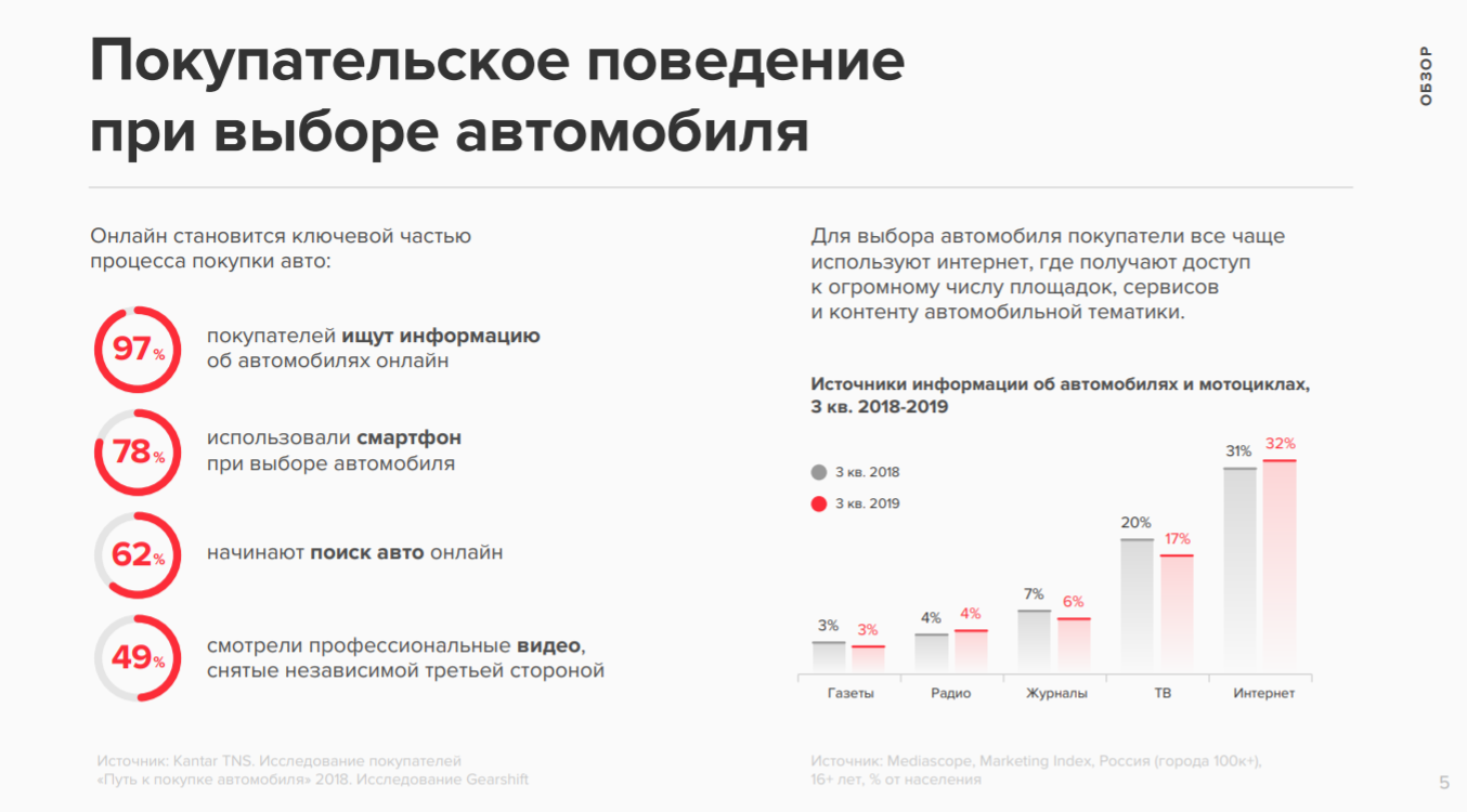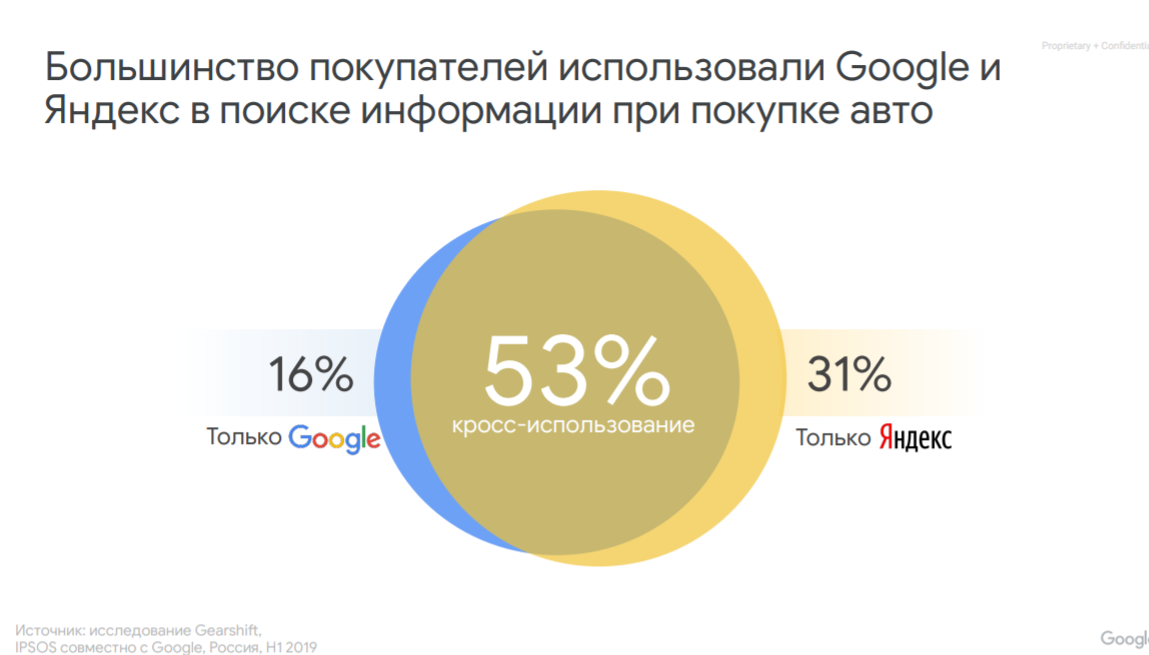 Чаще всего информацию об автомобилях ищут в интернете — 98% покупателей, по данным Google. При этом большая часть опрошенных (53%) использует для поиска две системы — Яндекс и Google.
