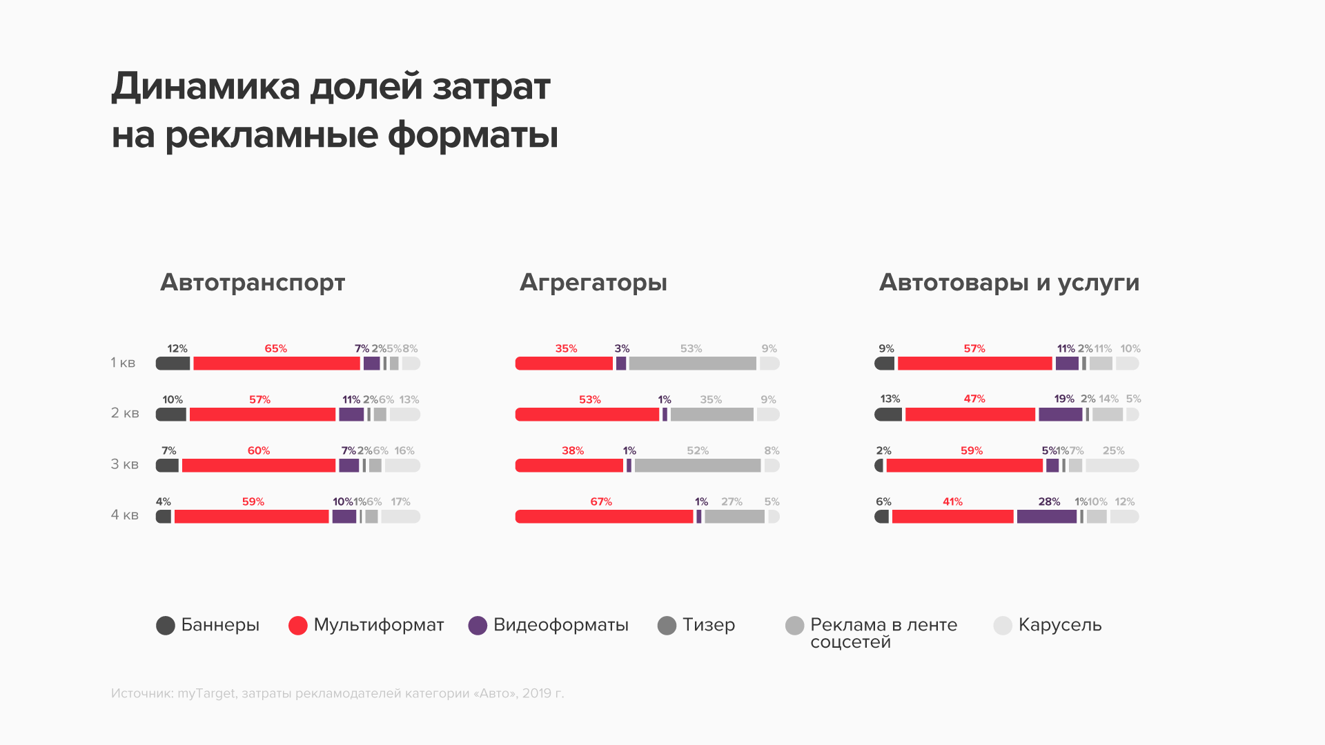 Среди форматов в рекламе автотранспорта и автотоваров лидирует мультиформат. Агрегаторы чаще используют рекламу в ленте соцсетей, в основном это нативное видео для продвижения мобильных приложений.