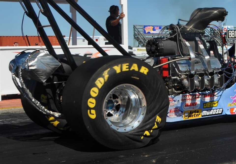 Шины драгстеров на таких скоростях, испытывают столь высокое сопротивление воздуха, что принимают аэродинамическую форму похожую на пятиугольники. Центробежная сила пытаетъся их разорвать в клочья, но благодаря огромному заднему споллеру, шины прижимаются к земле с 5 тонным усилием, помогая удержать болид на треке и помогая шинам бороться с центробежной силой.