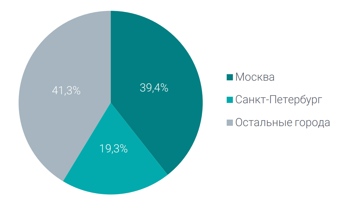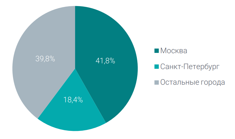 Москва — лидер по доле доставки «до двери» (64% заказов). Жители остальных исследуемых городов обращаются к пунктам самовывоза и доставке «до двери» примерно одинаково.