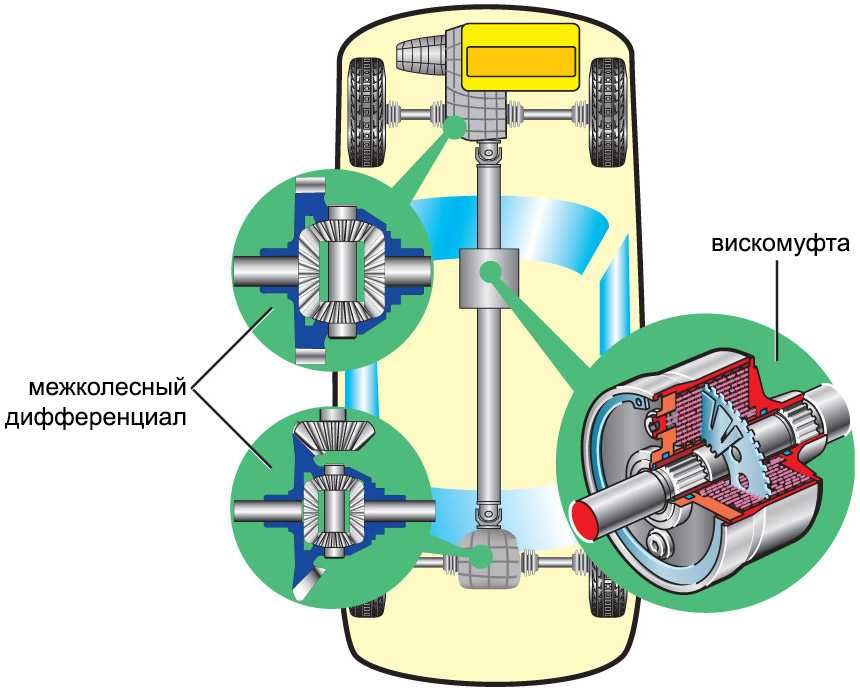 Реализуется это посредством межосевой муфты. Дифференциал отсутствует, а благодаря тому, что гидравлическая или электромагнитная муфта допускает проскальзывание осей, улучшается управляемость автомобилем в режиме полного привода.