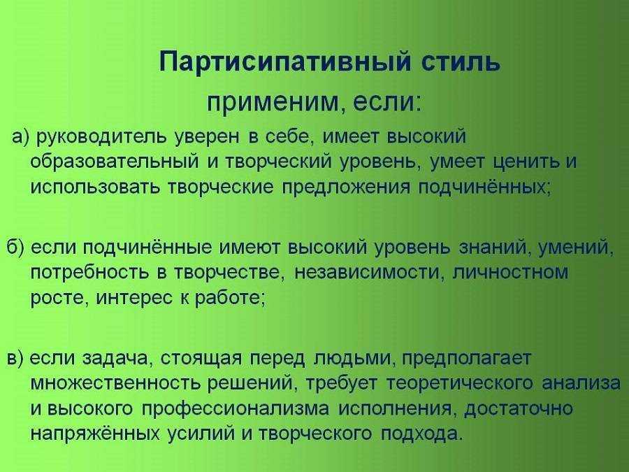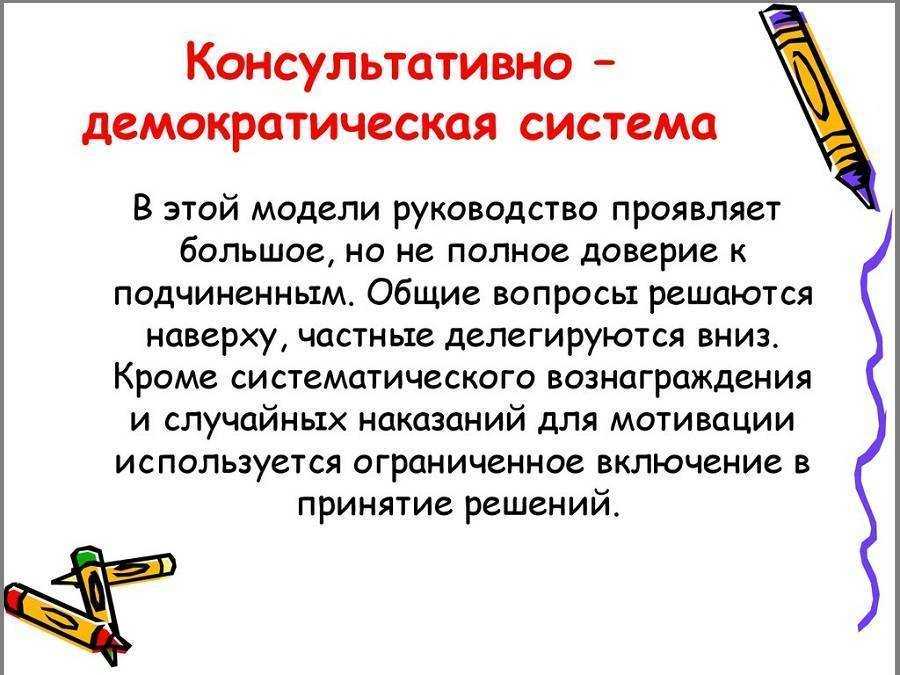 Начальник, доверяя своим работникам, перед принятием решений или постановкой задач консультируется с подчинёнными. В процессе такого общения руководитель отбирает лучшие и ценные предложения. На их основании формируются задачи. При таком подходе сотрудники получают удовлетворение от того, что могут поддержать начальника, подсказать ему правильное направление. Как результат – никого не смущает, что указания спускаются сверху. Обычно за хорошими предложениями следует поощрение.