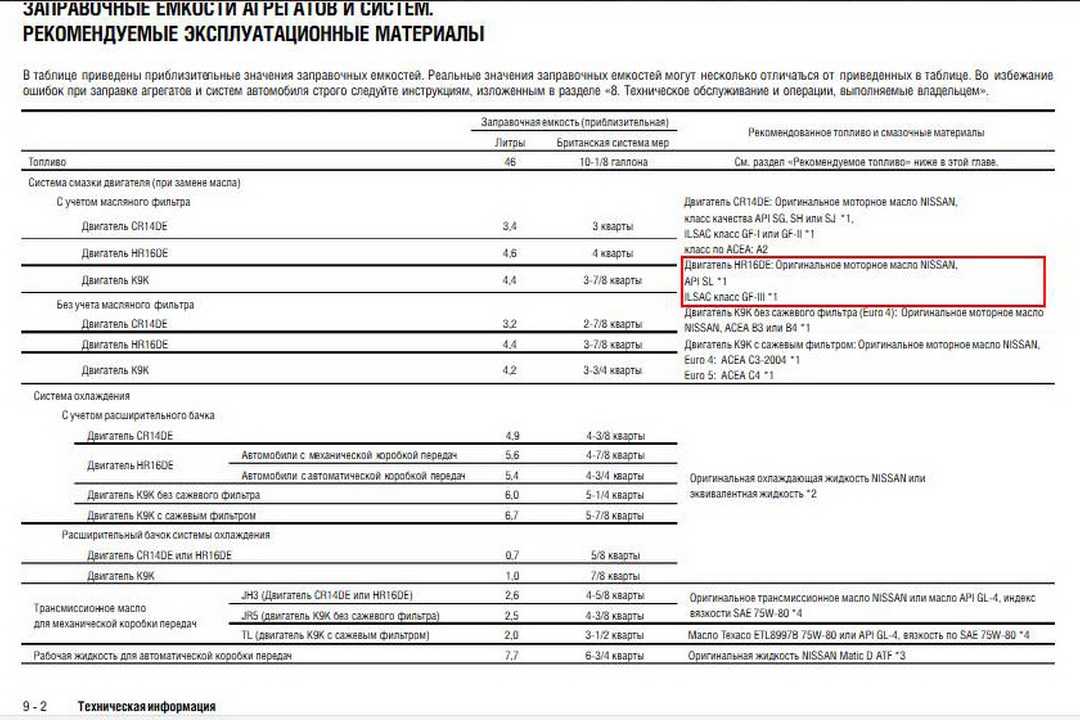 Фрагмент из «Руководства по эксплуатации» Nissan с двигателем HR16DE