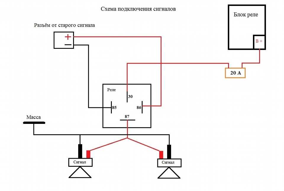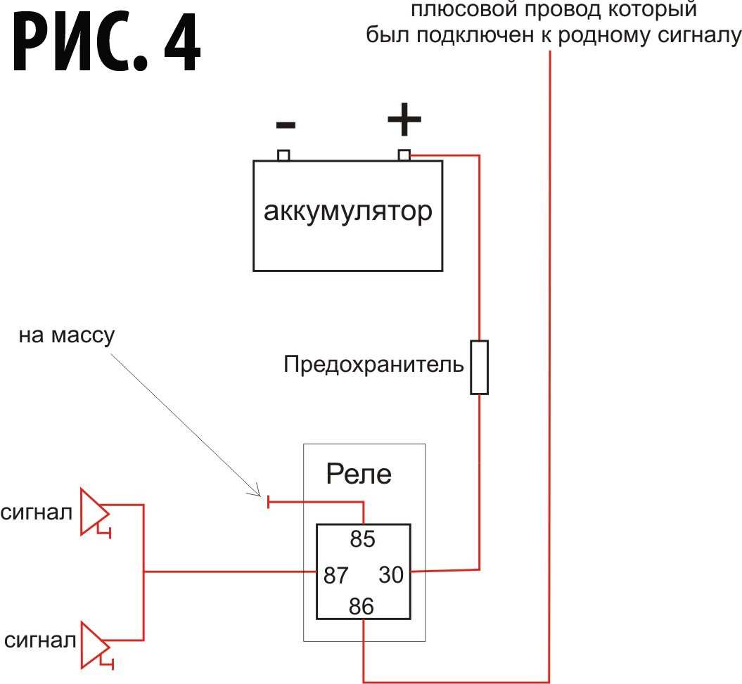 Используя данную схему можно подключить практически любое мощное устройство и управлять им небольшой красивой клавишей. Можно подстроить звук сигналов от Волги путем вращения спец. Дополнительное реле включения сигналов Массовый провод реле контакт 86 закрепляем под фланец крепления реле к кузову автомобиля через корончатую шайбу для обеспечения электрического контакта, предварительно установив на провод наконечник с ушком крепления.