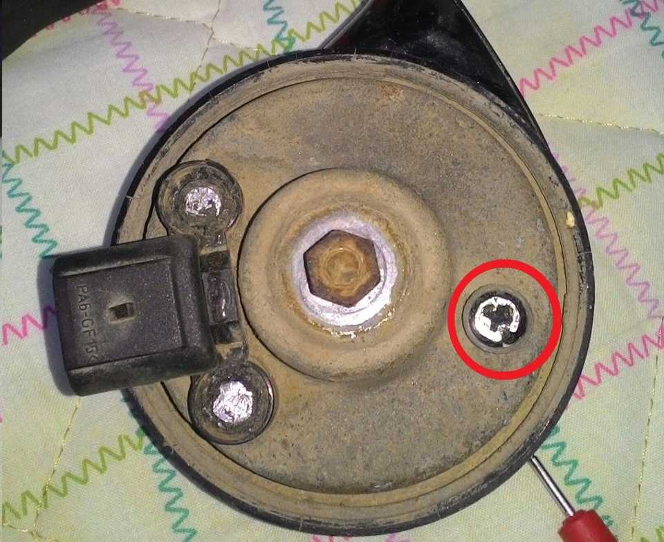 Но на сигнале есть еще один, как оказалось, винтик который замазан герметиком как и разъемы. Я по своему любопытству реши попробовать разобрать гудок. И решил выкрутить этот винтик)))) Когда я покрутил его отверткой в сигнале что то щелкнуло и я решил еще раз прозвонить его тестером…