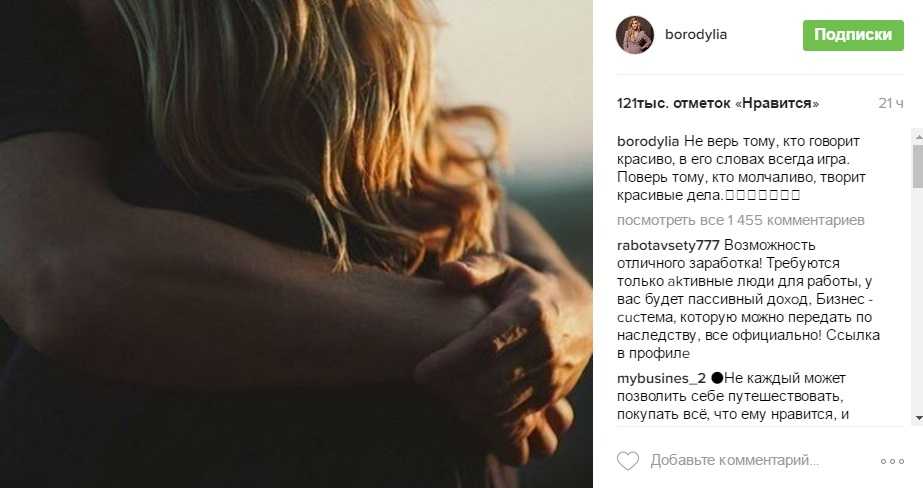 Затем накануне годовщины семейной жизни Бородина выложила в Инстаграм фото с подписью: «Не верь тому, кто говорит красиво, в его словах всегда игра. Поверь тому, кто молчаливо творит красивые дела».