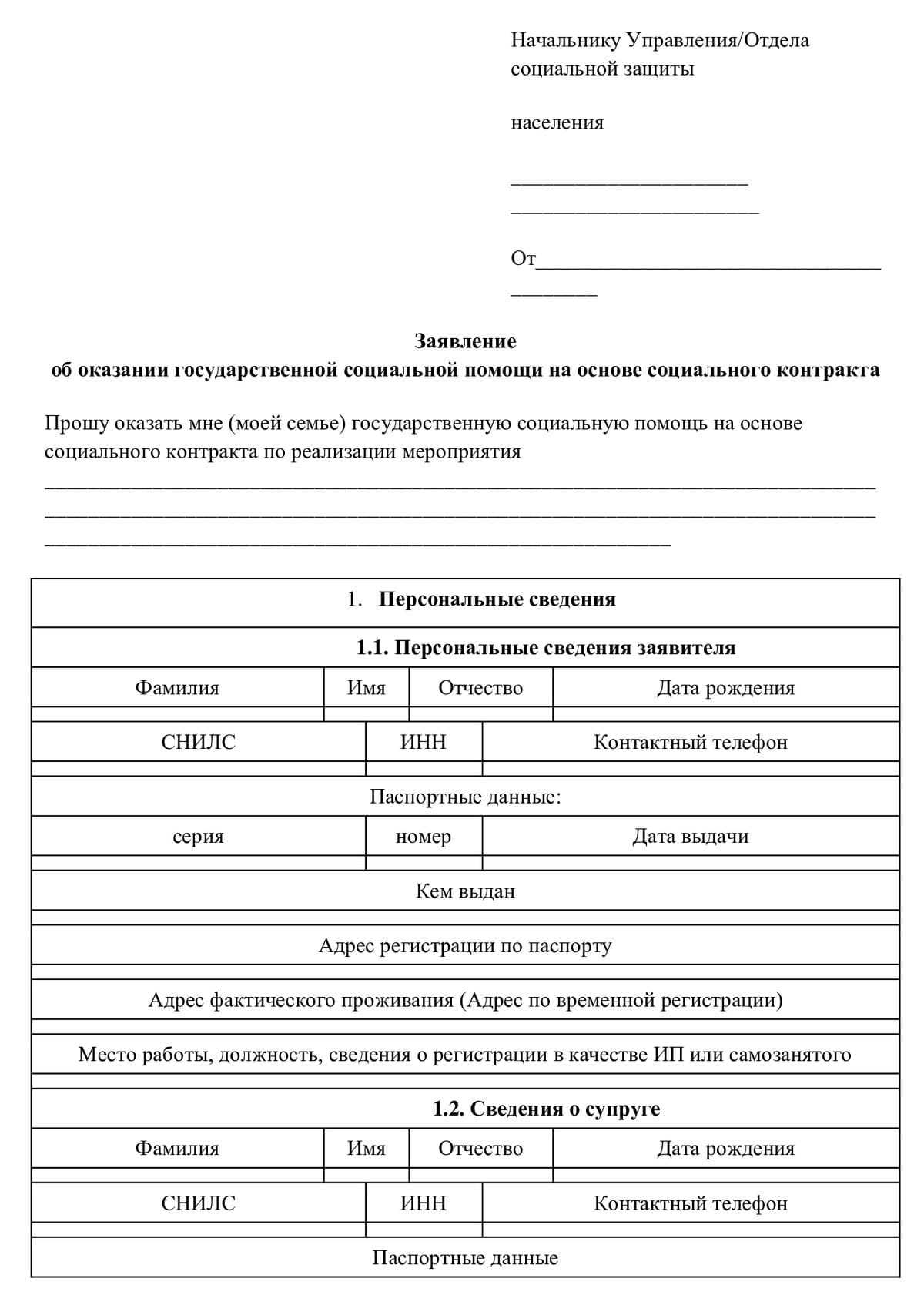 Заявление утверждается нормативными документами субъектов. Для примера приводим заявление на оказание государственной социальной помощи на основании социального контракта, разработанное в Калининградской области (Приказ Министерства социальной политики от 24.02.2021 № 10).
