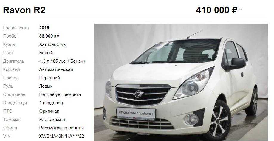 Всем Ravon R2 сейчас не больше трех лет, поэтому стоимость б/у вариантов не зависит от пробега. Салонный автомобиль 16-го года с пробегом 36 тыс. км отдается за 410 тыс. рублей: