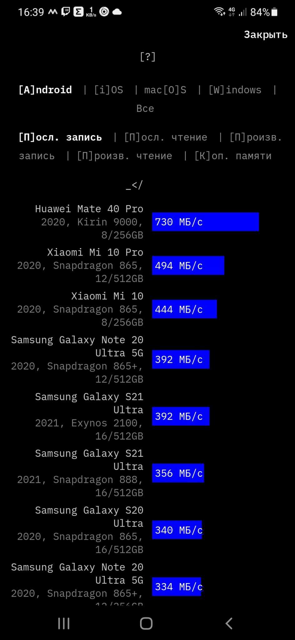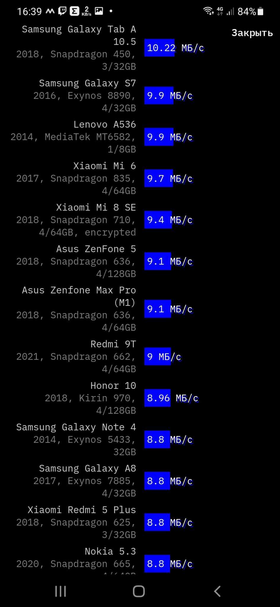 Видим, что для смартфонов 2020 года выпуска и выше нормальная скорость в двадцать (!) раз превышает результат на моей магнитоле. А вот значения в районе 10МБ/сек и ниже можем наблюдать на устройствах 5–8 лет давности.