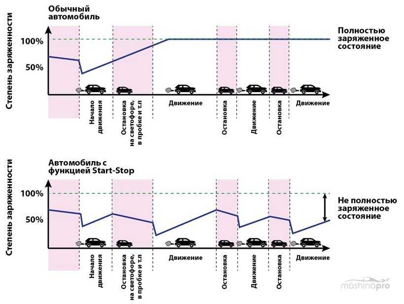 Основой его является такой подход – при остановке (в пробке, на светофоре и т.д.) мотор глушится (стоп), а при необходимости начать движение запускается (старт). Все эти действия выполняет электроника, анализируя показания датчиков о режиме работы двигателя и выполняемых водителем действиях. В некоторых случаях этот процесс дополняется рекуперацией, торможение также способствует получению дополнительной зарядки АКБ.