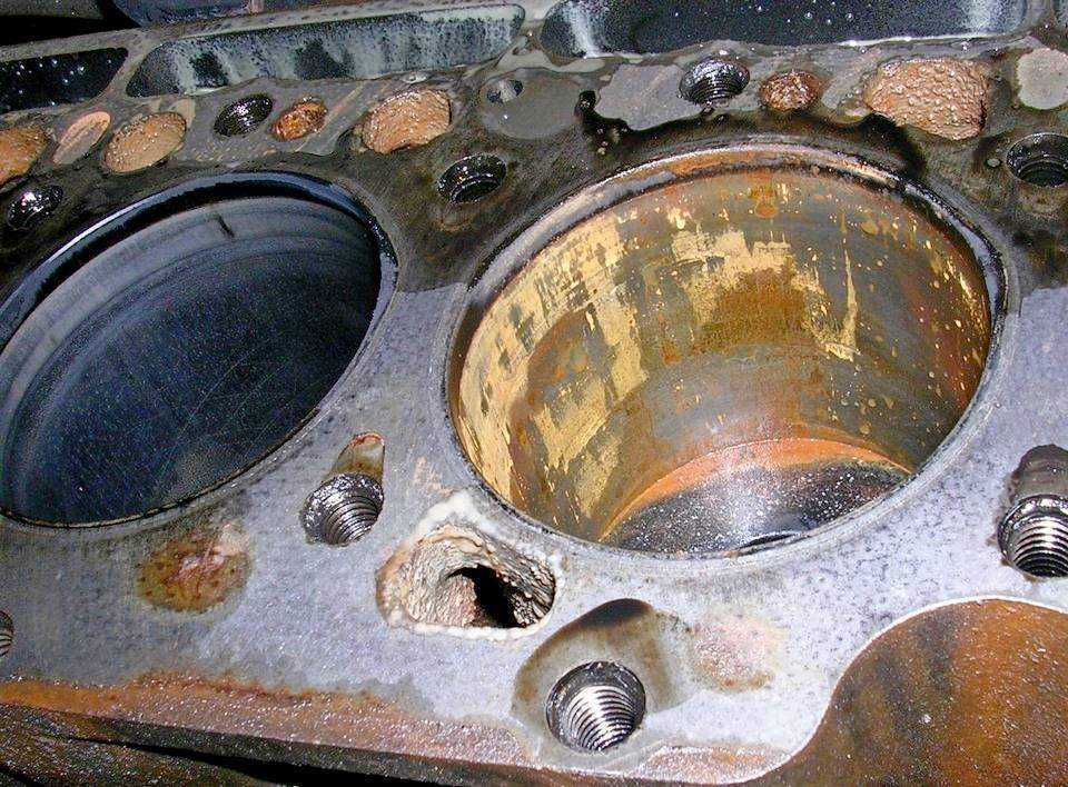 Затекание жидкости в камеры сгорания несет в себе большую опасность. Блок цилиндров, поршневая группа и другие элементы ДВС механически повреждаются. Деформация ведет к трещинам и расколам. Детали испытывают критические нагрузки.