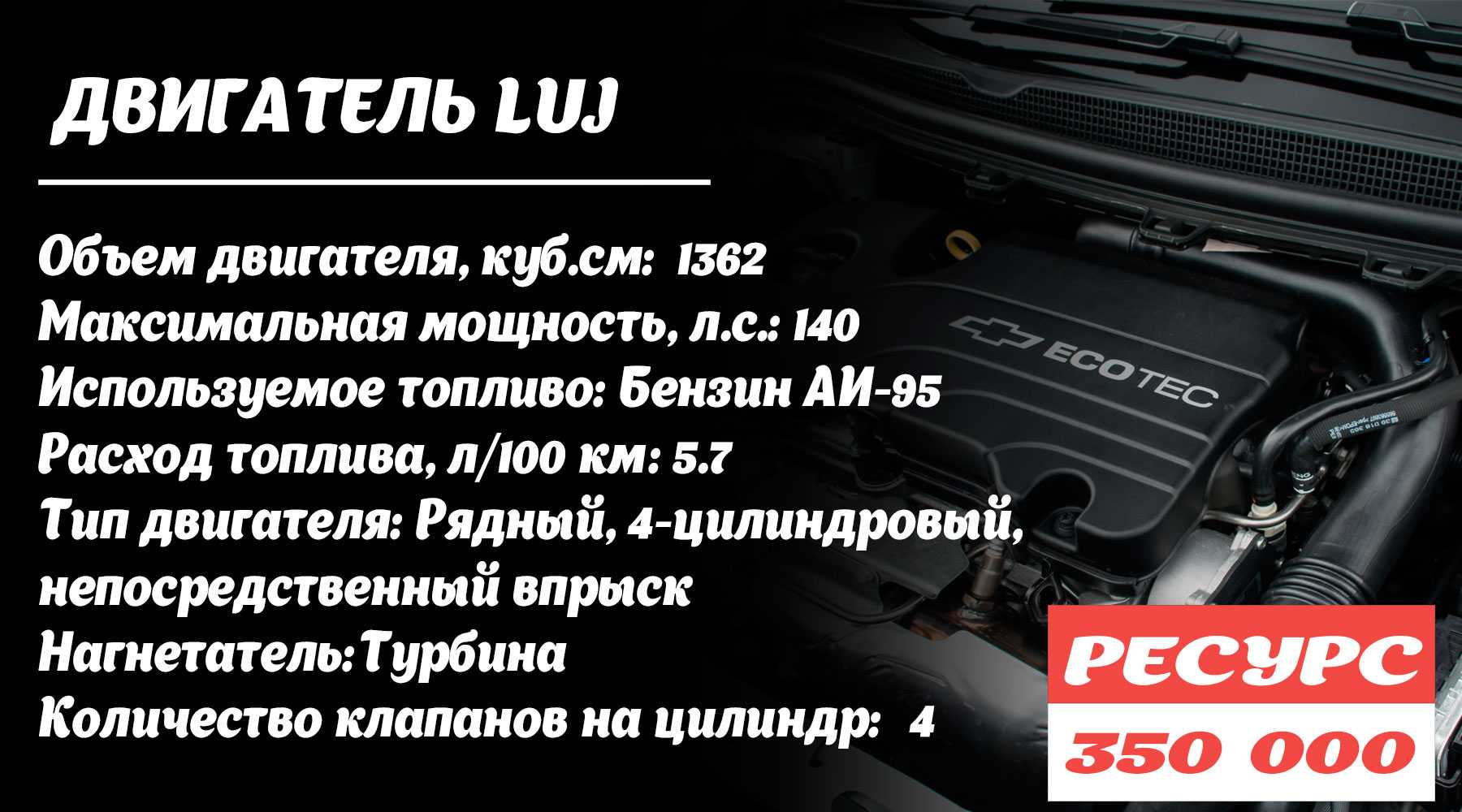 В 2012 году Chevrolet Cruze получил турбированный бензиновый мотор LUJ. Фактически агрегат является точной копией A14NET, который хорошо известен рядовым автолюбителям по модельному ряду Opel. Несмотря на общую конструктивную идентичность, некоторые отличительные особенности каждый из моторов имеет. Например, LUJ получил систему непосредственного впрыска топлива, когда в A14NET распределенный впрыск топливной смеси в цилиндры двигателя. За счет турбины невысокого давления (примерно 0.5 бар) обе установки снимают одинаковое число лошадиных сил – 140. Что касается его общей конструкции, то состоит LUJ из алюминиевого блока цилиндров с 16-клапанной головкой из легких материалов. Максимальный крутящий момент 200 Нм генерируется при достижении мотором 4900 оборотов в минуту. В качестве привода газораспределительного механизма выступает цепь. Она повышает надежность двигателя, следовательно, ресурс, но её не хватает на весь срок эксплуатации автомобиля.