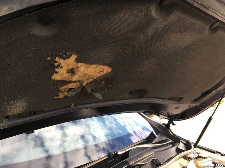 Подкапотная шумоизоляция ободрана, как так вышло — неизвестно.