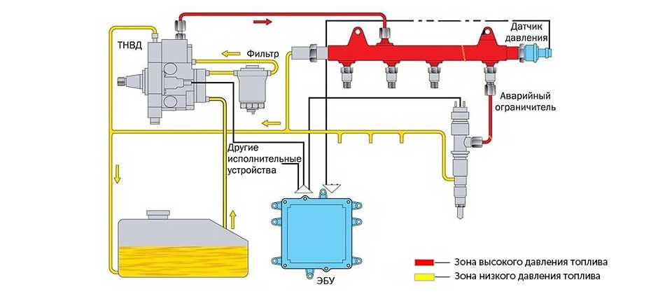 - Падение давления в рампе ниже допустимого – регулятор направляет большую часть топлива по обратной линии в бензобак.