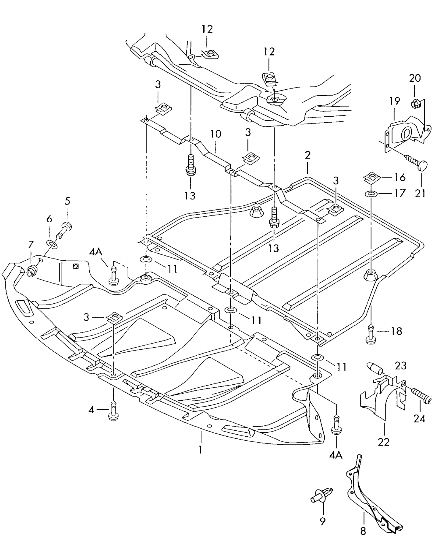 На дворе 2019 и к этому времени уже у большинства авто защита двигателя держится на кабельных стяжках, самодельном крепеже или вовсе отсутствует, но есть бюджетное решение вопроса — заказать комплект крепежа для защиты с китая http://ali.pub/3bhmu2. Стоимость комплекта около 3$. Единственное в нем не хватает резиновых шайб — на схеме под номером 11 (VAG 4A0-805137). Я этих шайб и на машине не видел) Видимо они кроме амортизации еще и удерживают винты в защите, тем самым уберегают от их утери. Такие резиновые шайбы думаю по силам вырезать каждому самостоятельно. И еще одно замечание после покупки данного комплекта — железки которые под номером 3 на схеме (VAG 8D0 805960) — мягко говоря — весьма некачественные в этом китайском наборе!!!! Их все же придется искать в магазинах автокрепежа.