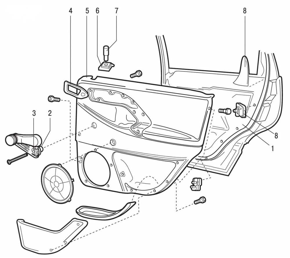 Работы на всех дверях проводятся аналогично, в качестве примера приведены работы, выполняемые на двери водителя.