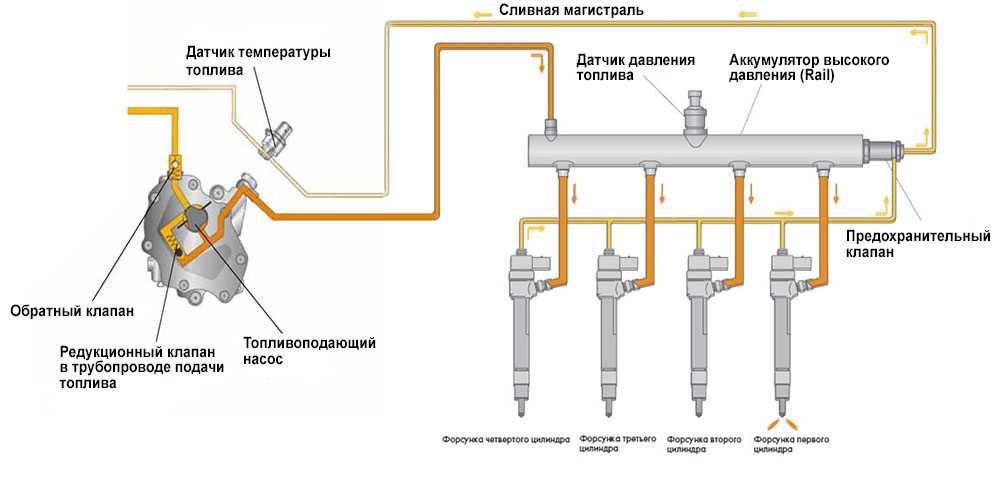 Суть этой конструкции заключена в том, что насос высокого давления качает топливо не к каждой форсунке по отдельности, как это было в механической системе, а закачивает его в магистральный трубопровод (рампу). А уже из нее оно подается на форсунки.