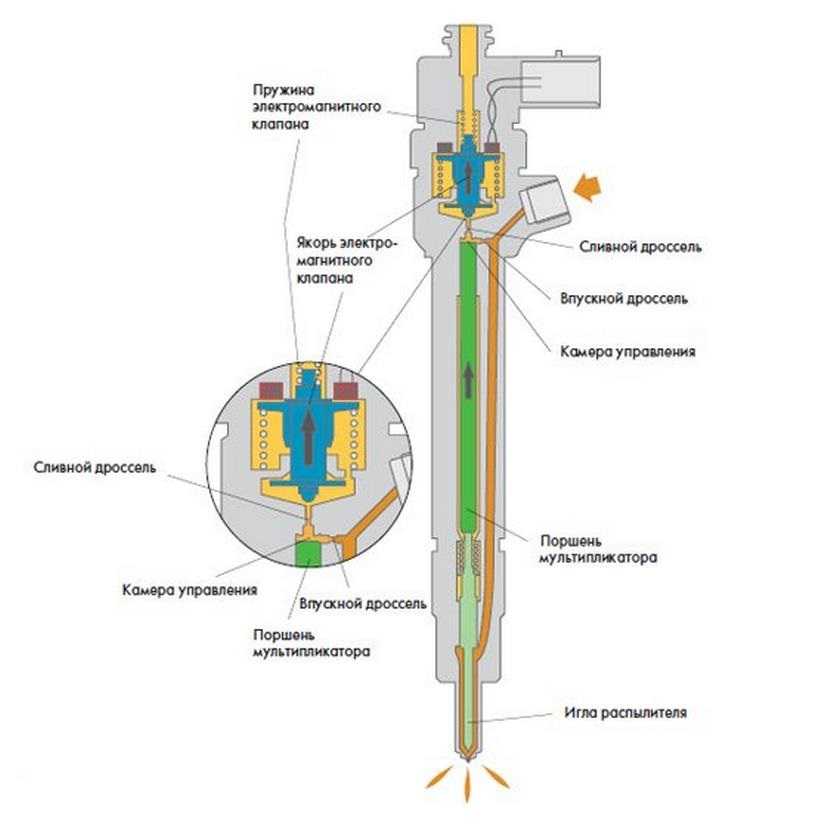 Принцип топливной системы common rail подразумевает использование одного из двух видов форсунок.