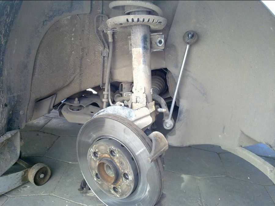 - Открутить болт, удерживающий стойку на поворотном кулаке.
