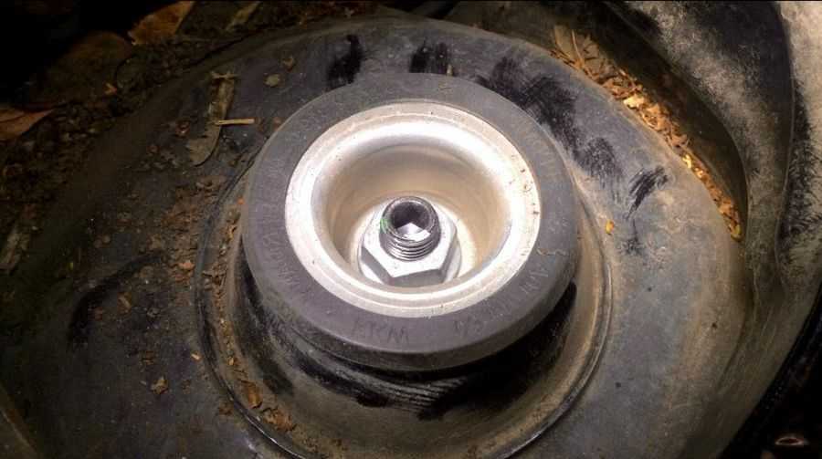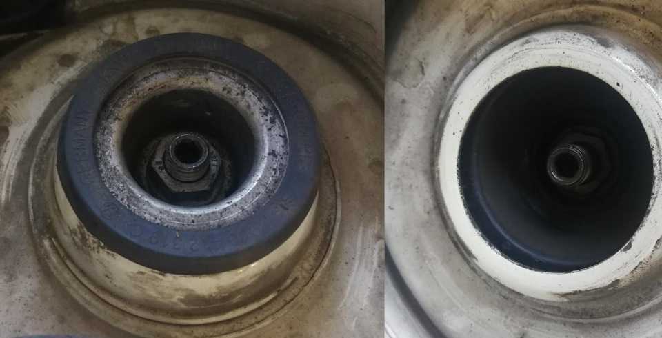 А вот на авто, где подшипник обеспечивает только вращение стойки и с амортизатором он не взаимодействует, нарушение развала-схождения практически не происходит, поскольку шток от осевого смещения удерживает втулка, запрессованная в резиновый демпфер.