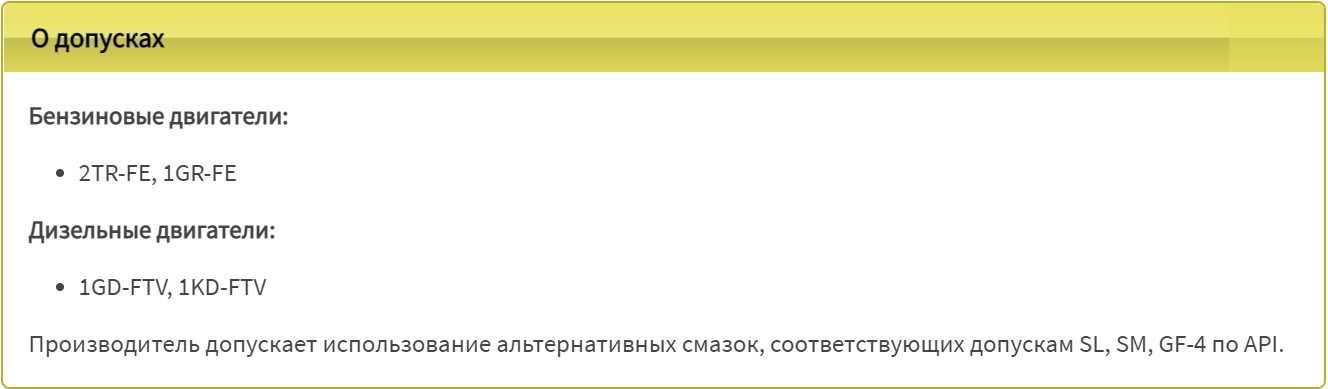 В мануале Тойота Прадо указаны такие требования к смазочным материалам: