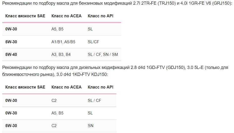Характеристики рекомендуемого моторного масла для Toyota Land Cruiser Prado зависят от типа двигателя.