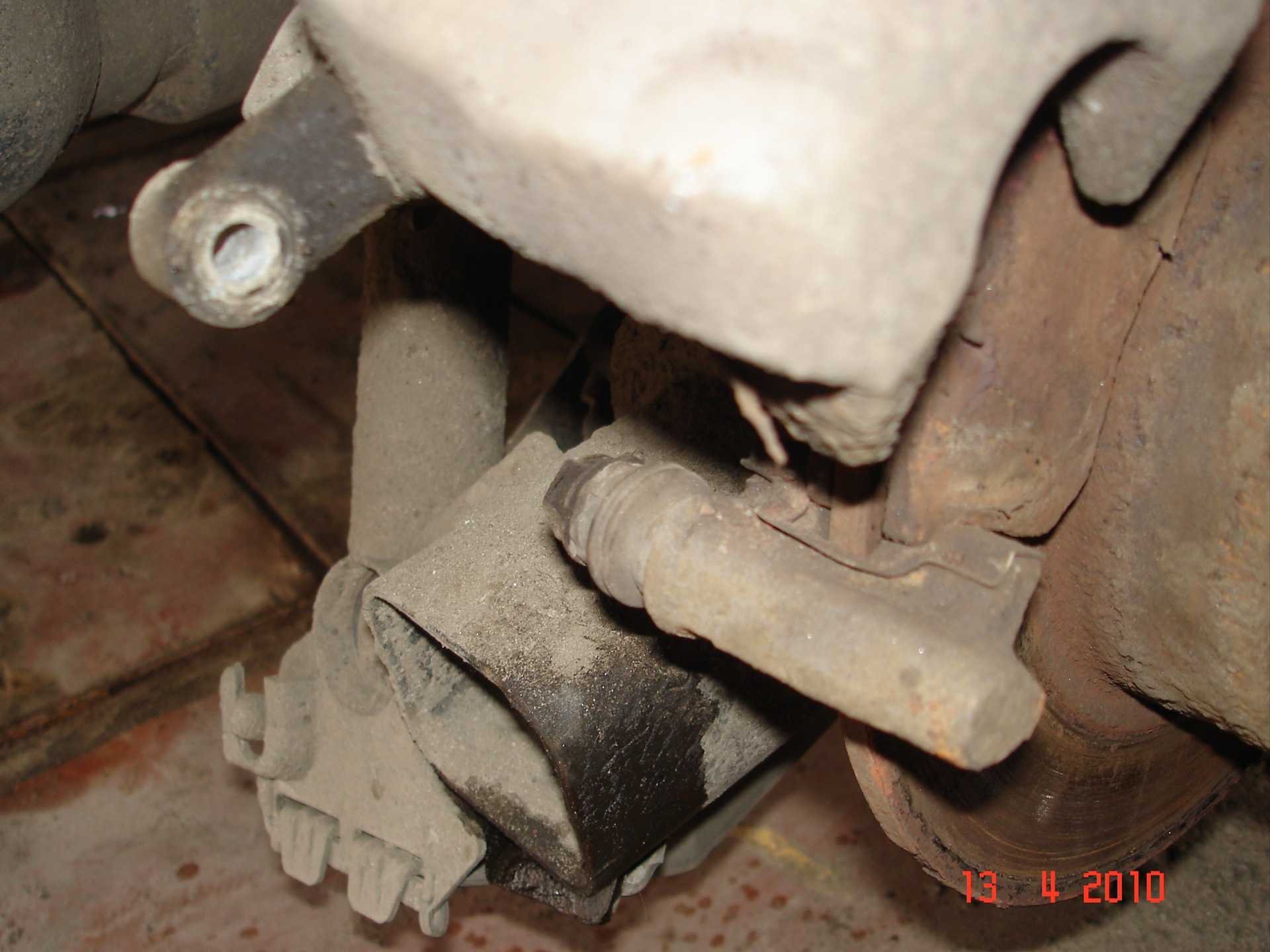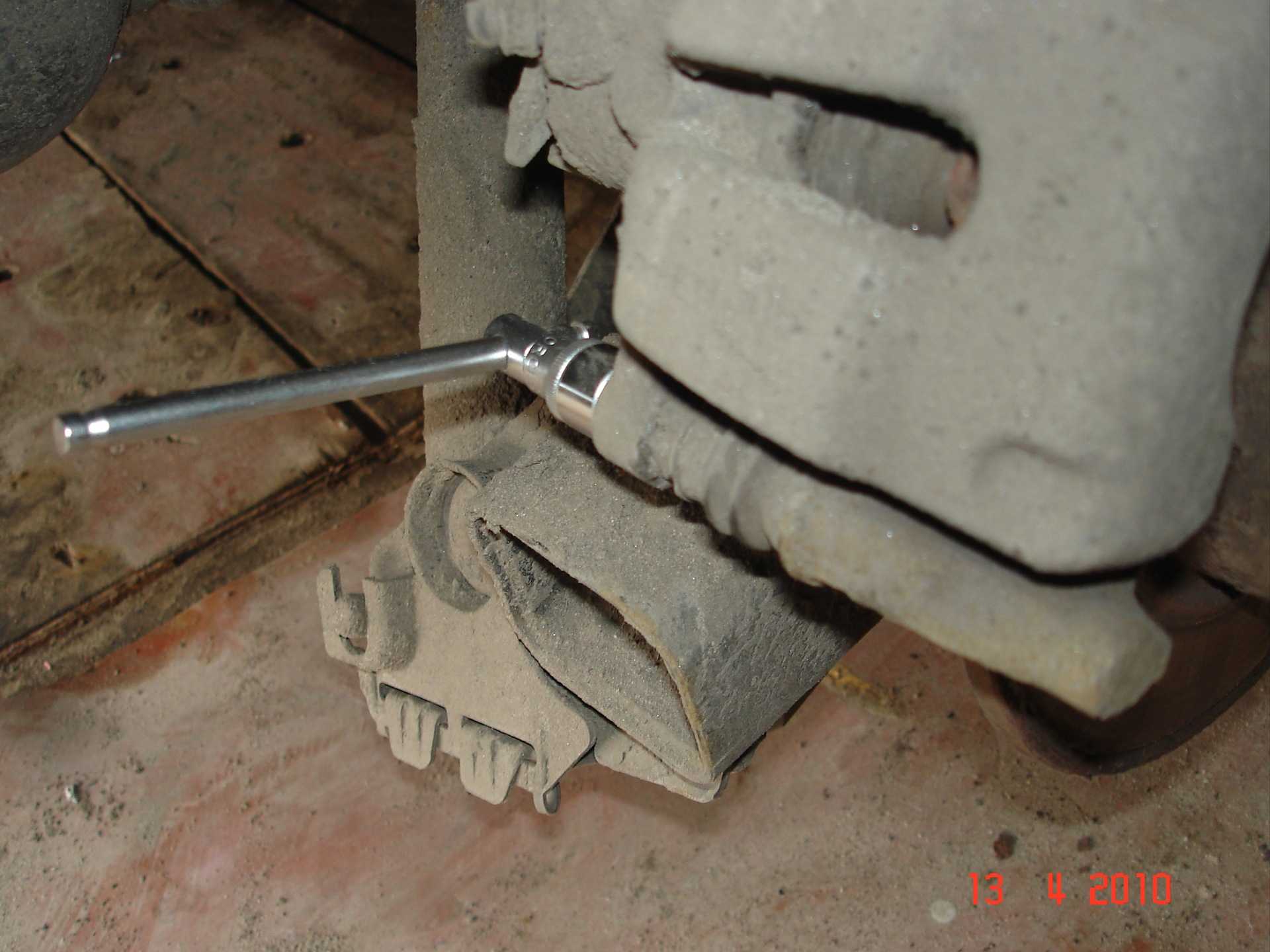 Если меньше 9 мм то пора менять; [Рис. Но обо всём по порядку. Итак, автомобиль уже стоит на домкрате, и мы снимаем заднее колесо, после чего откручиваем два болта под ключ на 13 мм.