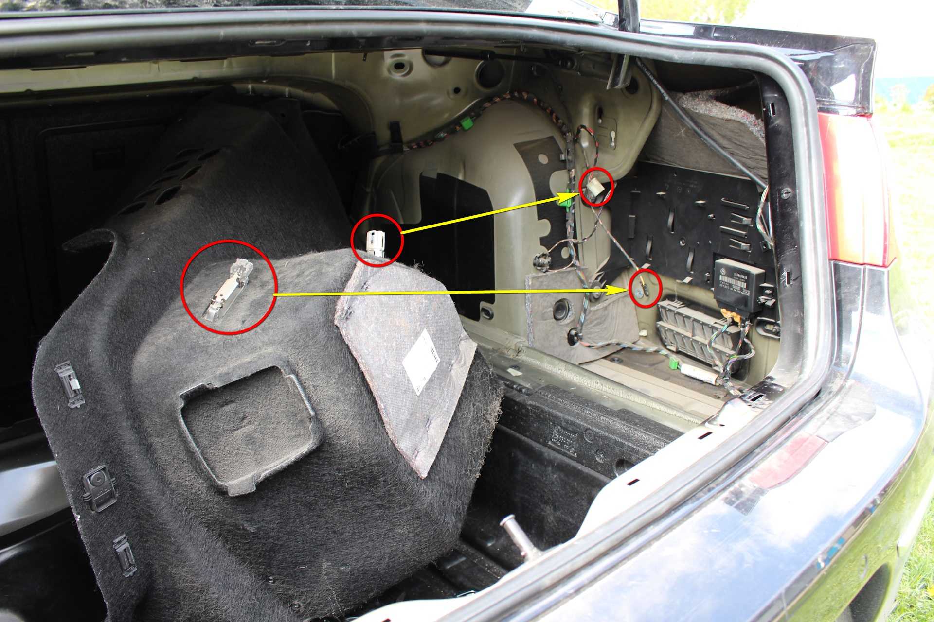 - Снять обшивку с правой стороны багажника. В процессе придется демонтировать накладку проема, фиксирующие кольца, плафон подсветки и открутить несколько болтов.