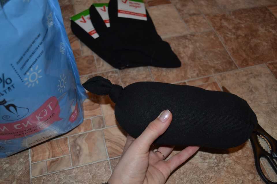 После того, как он впитает в себя влагу и намокнет, его можно просушить и использовать снова. Когда вы наполнили носок, завяжите его на узел. В итоге получится вот такой мешочек.